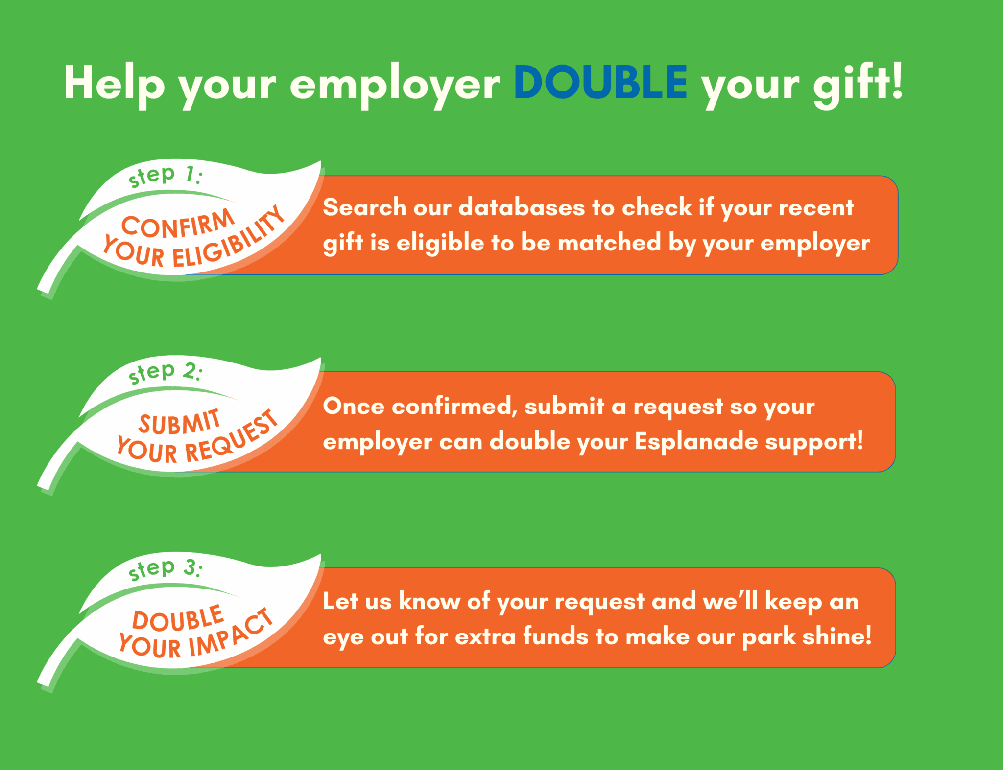 Help the Esplanade thrive— twice over! Many employers offer matching gifts, which means your contribution could provide two times the care for the Charles River’s favorite backyard. It only takes a moment to verify eligibility through Double the Donation—and your added support makes a real, lasting difference for the park you love.